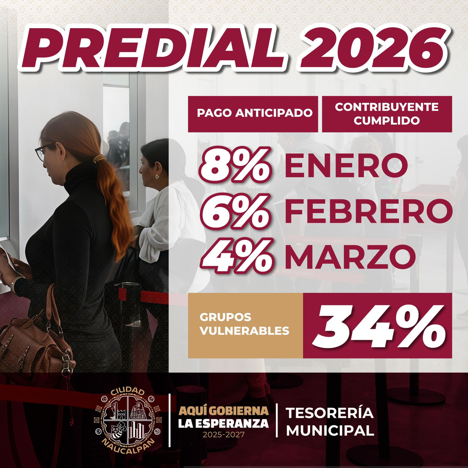 El Gobierno Municipal de Naucalpan, encabezado por el alcalde Isaac Montoya Márquez, invita a las y los contribuyentes a beneficiarse con las bonificaciones propuestas y aprobadas por el Cabildo en el pago del impuesto predial y agua potable desde este 2 de enero de 2026.