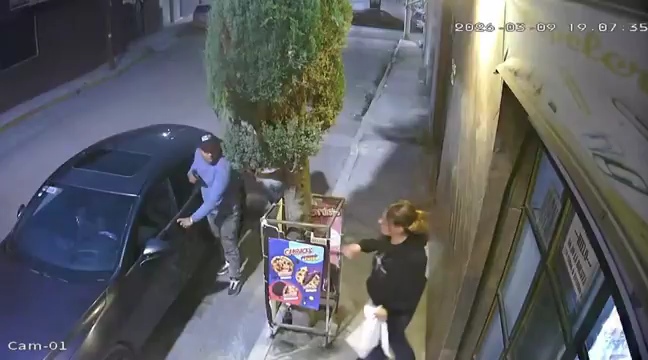 En el vídeo del pasado 9 de marzo se puede ver cómo llegan los ladrones en un auto color blanco, mientras la mujer se arregla el cabello y se pone «mona» el hombre amaga a la mujer con un arma de fuego para despojarla de las llaves del automóvil.